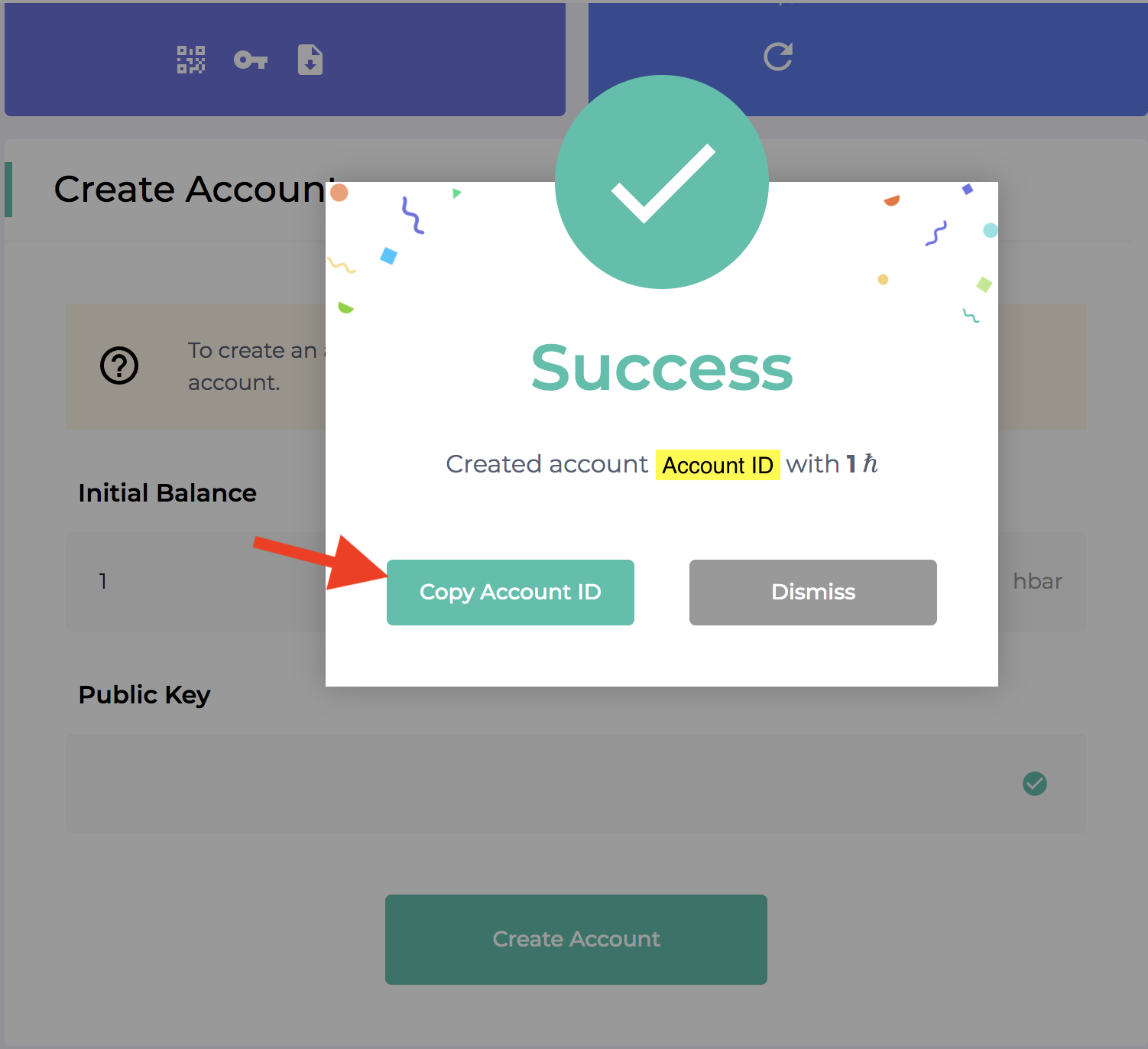 - Your new account has been created. Copy the Account ID to finish logging into your new MyHbarWallet