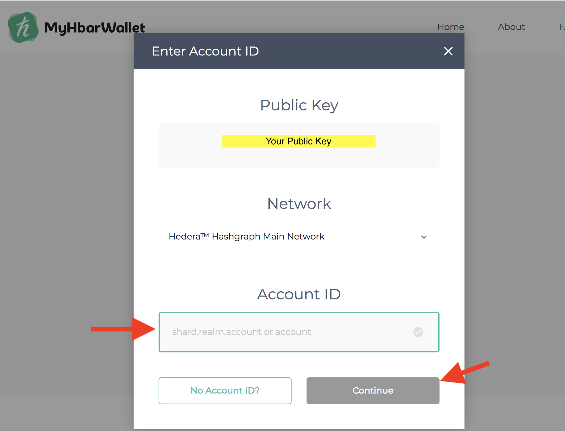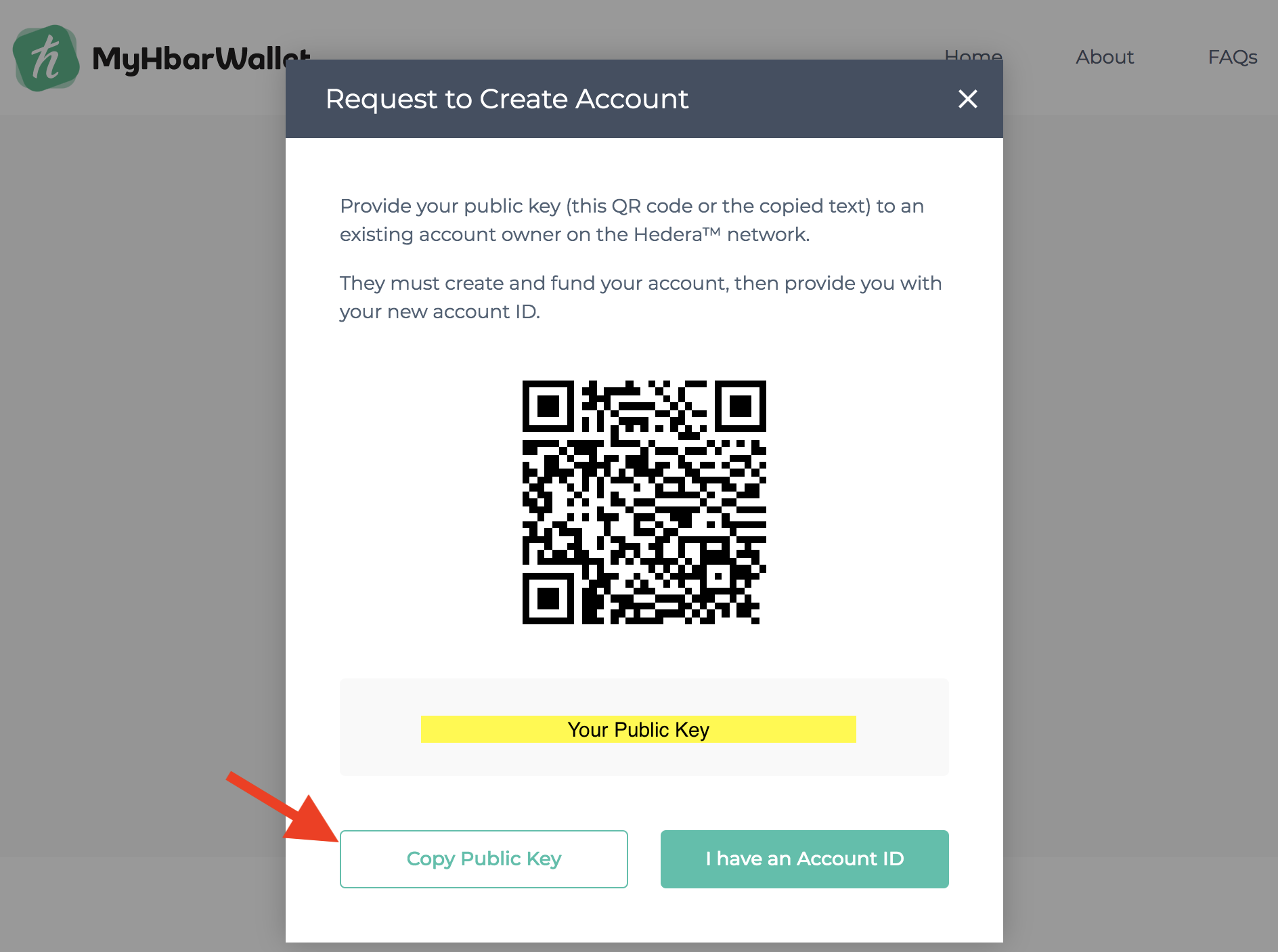 - Copy your Public Key to give to the existing MyHbarWallet account