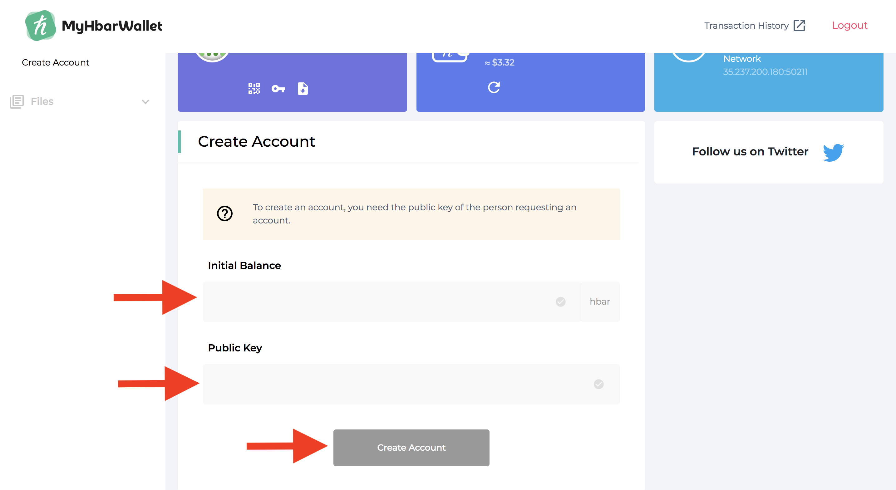 Step 2: Using an existing Hedera account and the public key you just retrieved, create a new account in MyHbarWallet