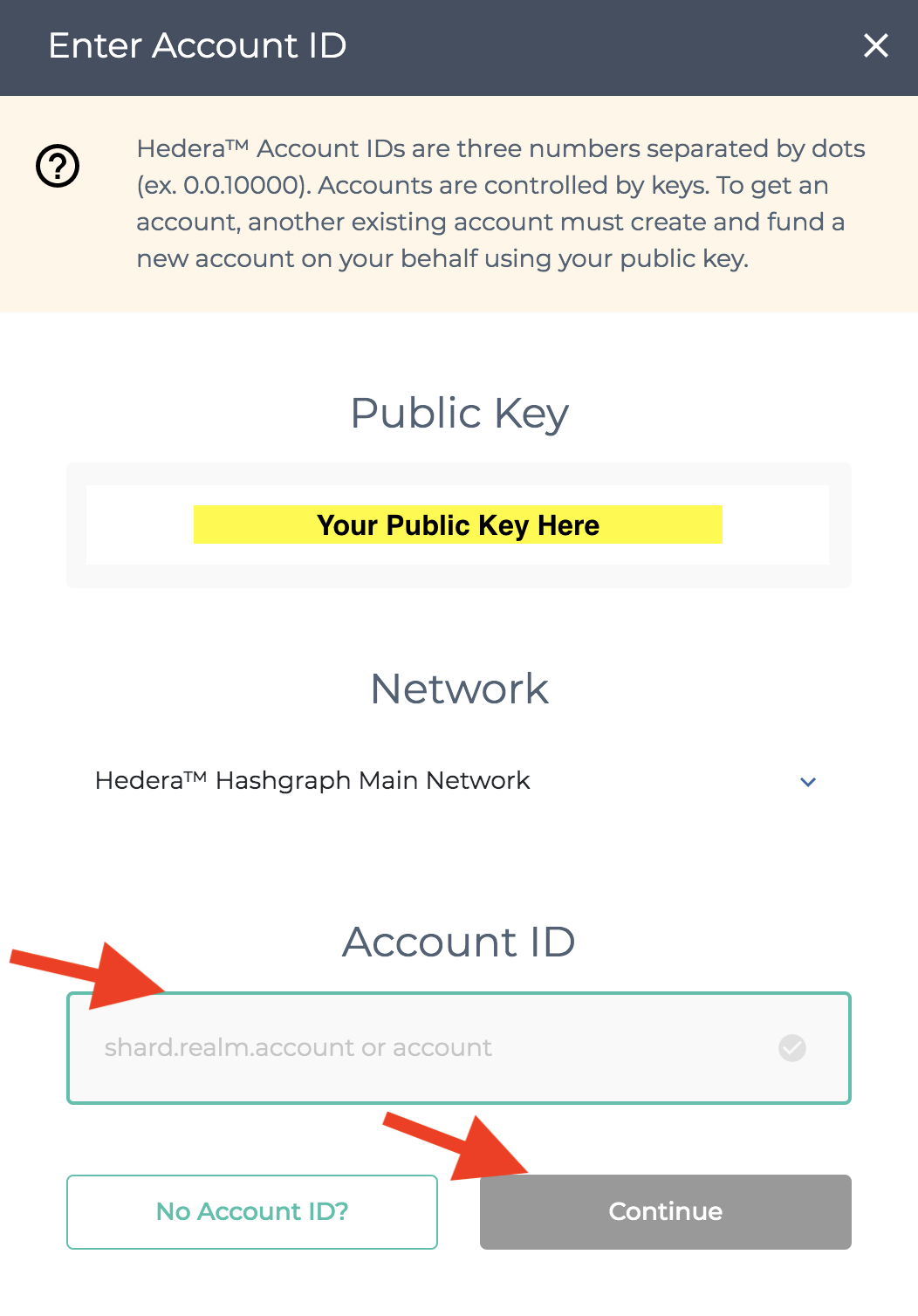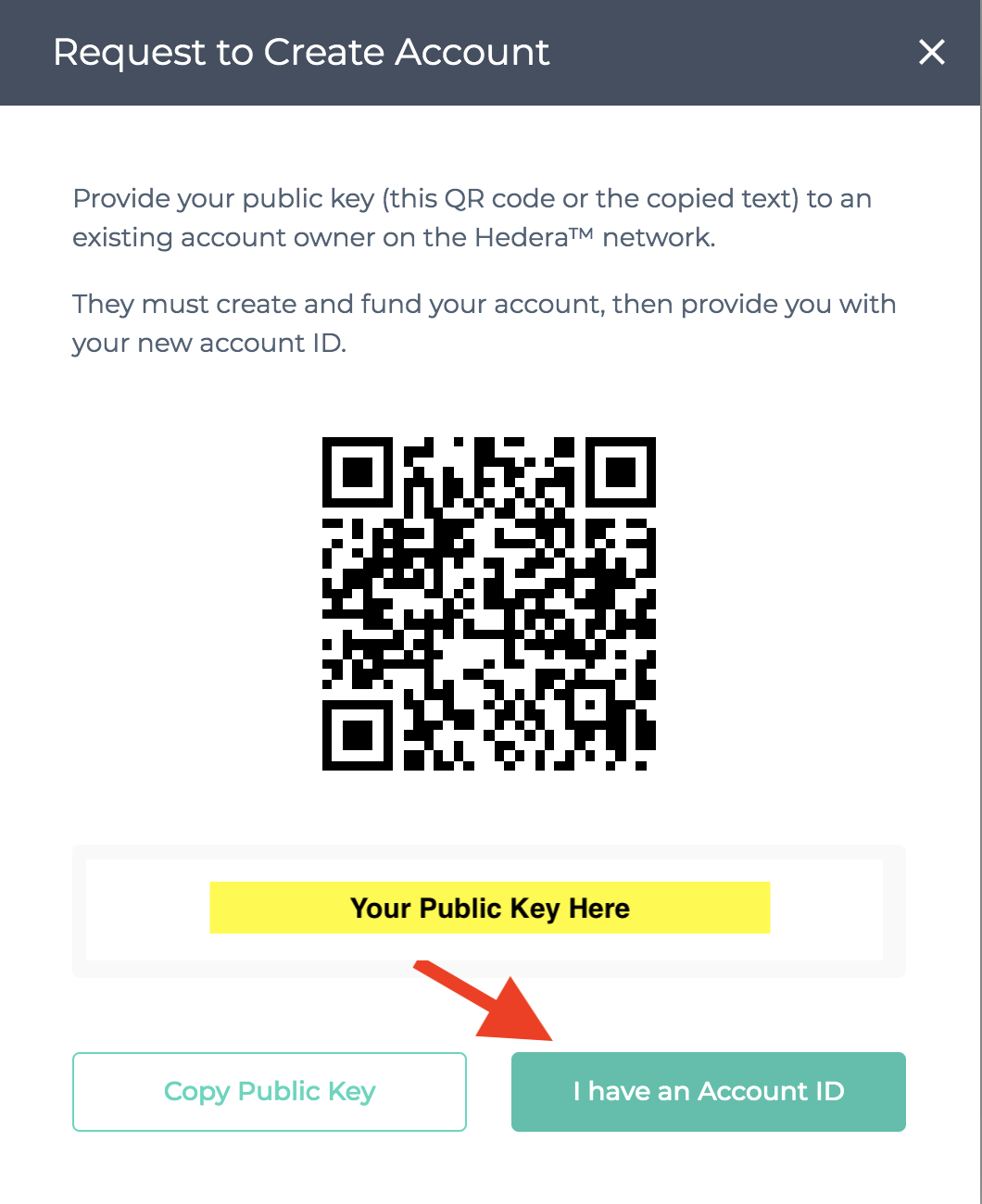 - MyHbarWallet will now show your Ledger's public key. Copy the public key to give to the existing MyHbarWallet account.