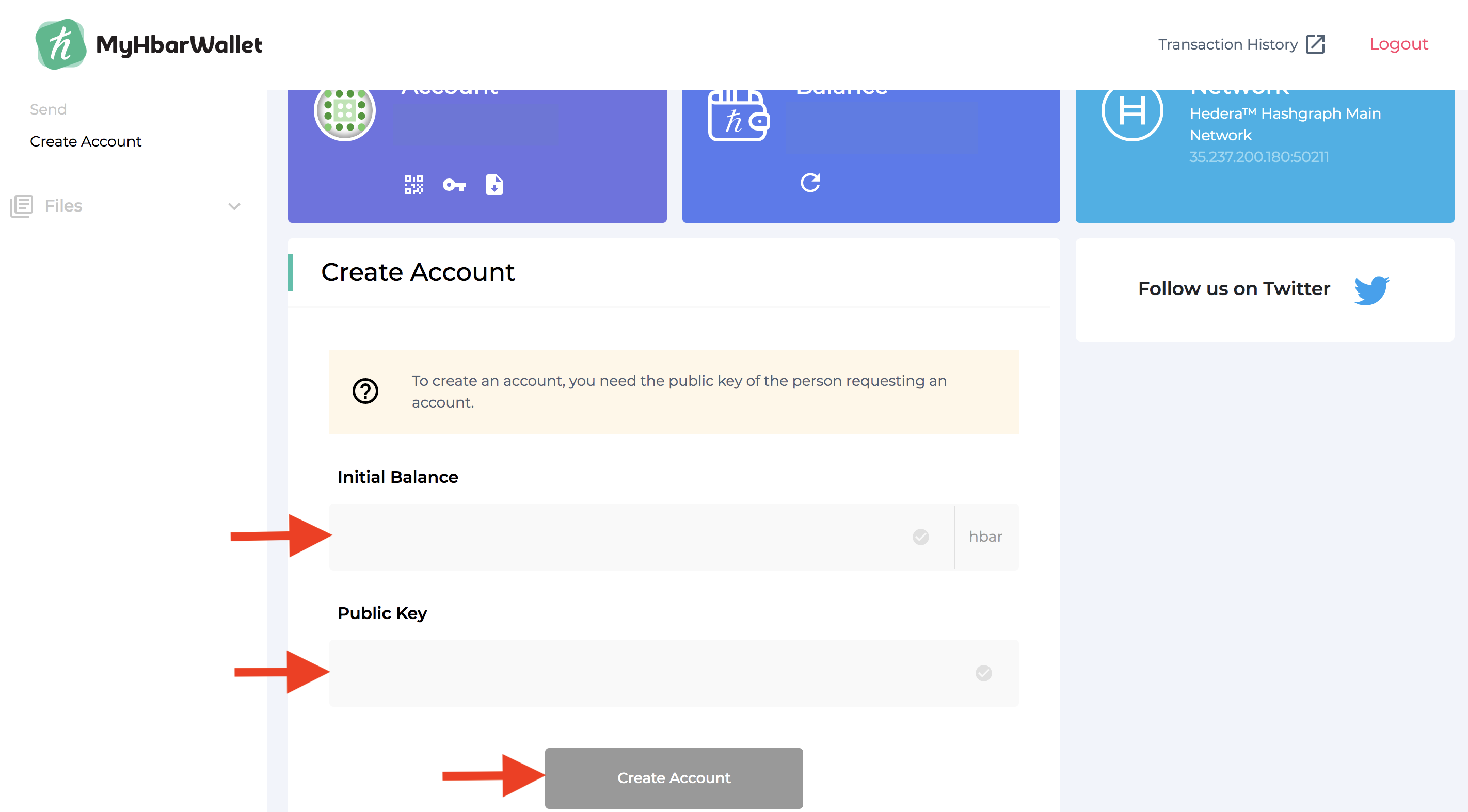 Step 4: Using an existing Hedera account and the public key retrieved from your Ledger device, create a new account in MyHbarWallet