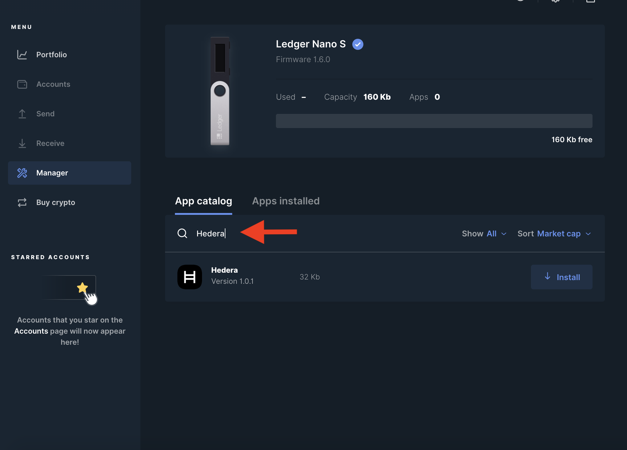 - Once successfully installed, you should now be able to see the "Hedera" app on your Ledger device