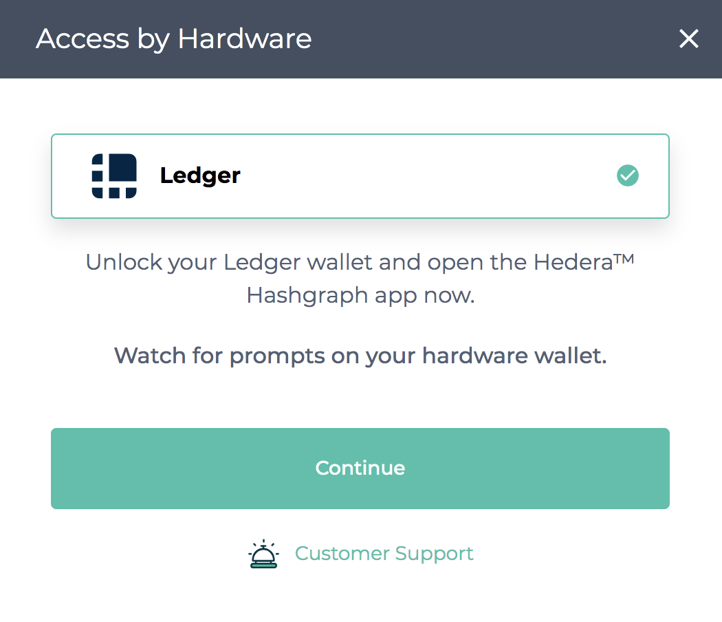 - If your Ledger device is not connected from the "Setup" step, make sure it is connected now and open the Hedera app on your Ledger. Then click "Continue"