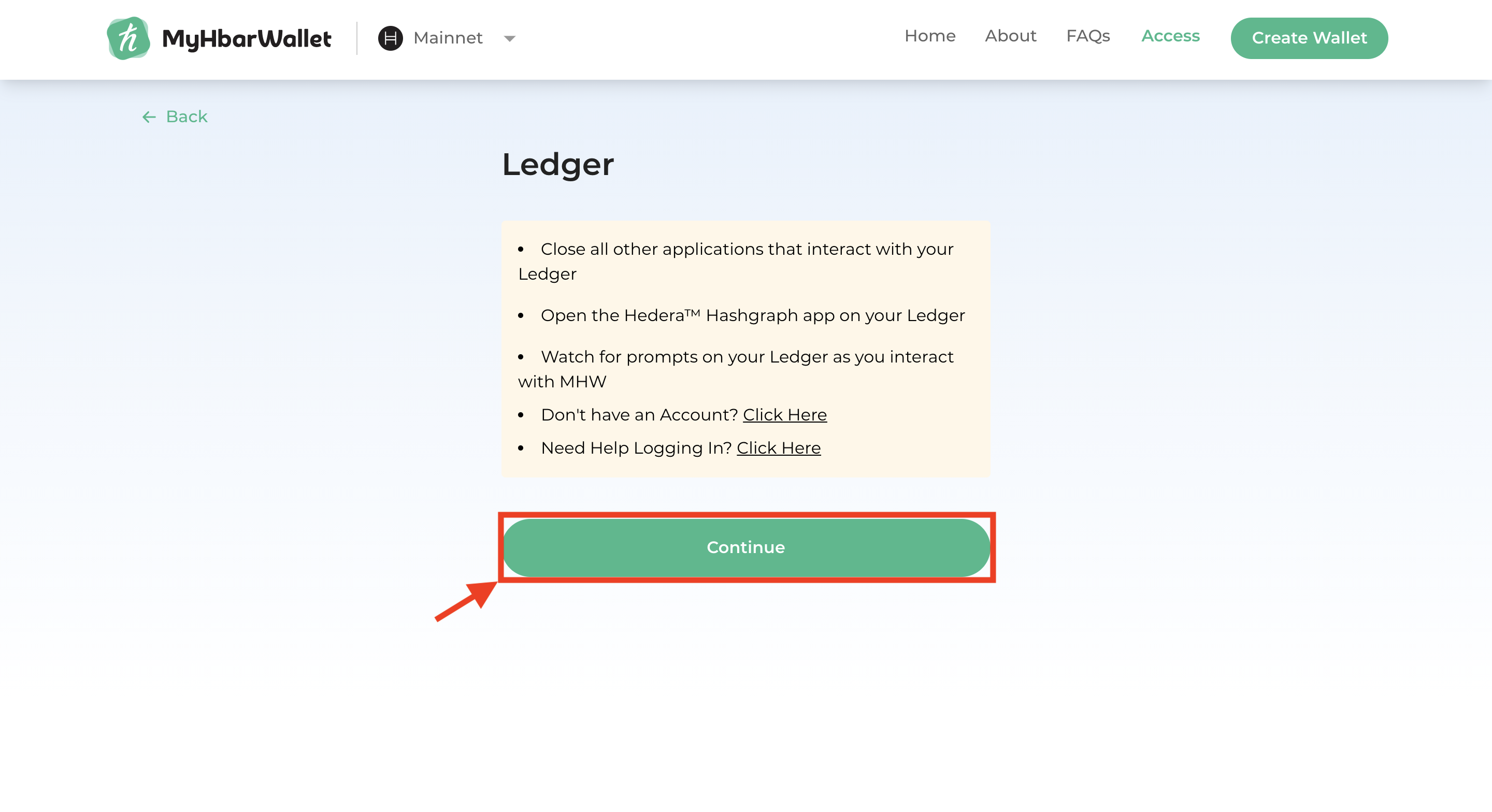 - If your Ledger device is not connected from the "Setup" step, make sure it is connected now and open the Hedera app on your Ledger. Then click "Continue"