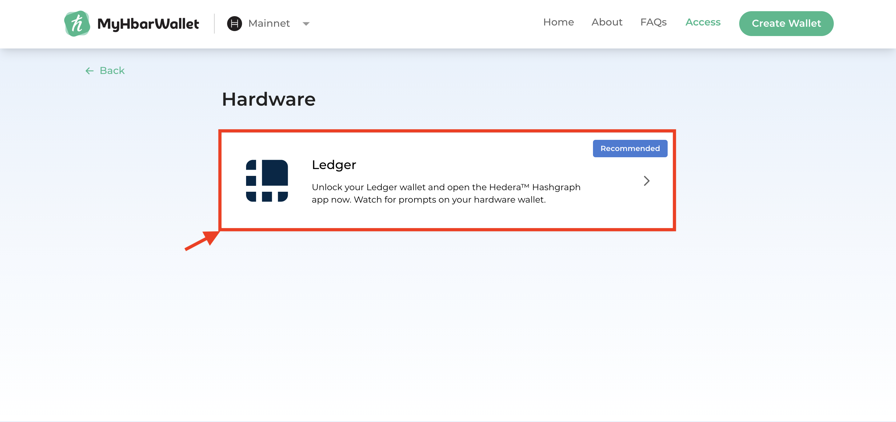 Step 3: Start creating your Hedera account by retrieving your Ledger public key via MyHbarWallet