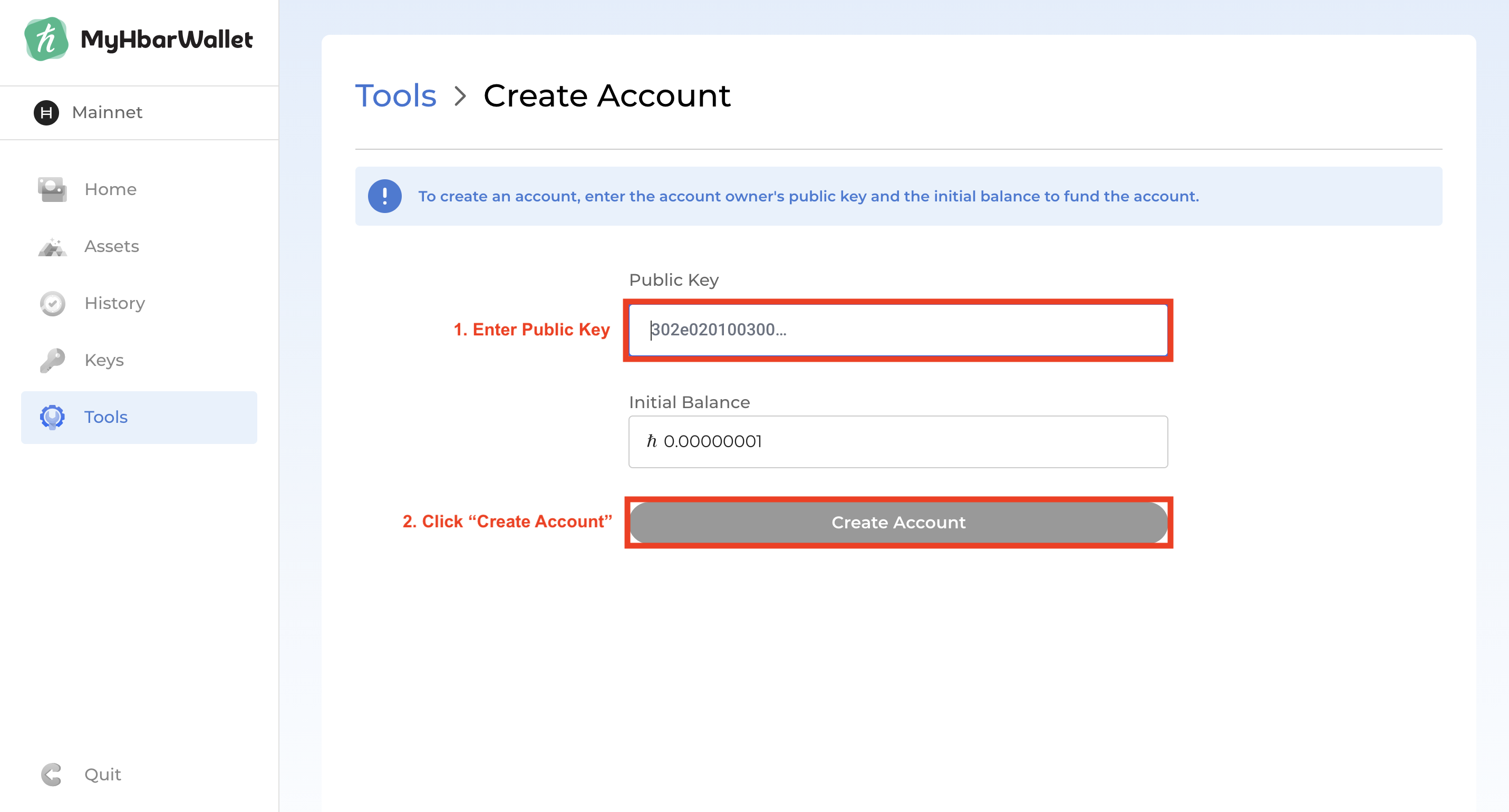 - Enter the initial balance you would like for your new Ledger account to have. The default is set to 0.00000001 HBAR (It takes a very small amount for account creation). Then enter the public key that we obtained from your Ledger and click "Create Account"