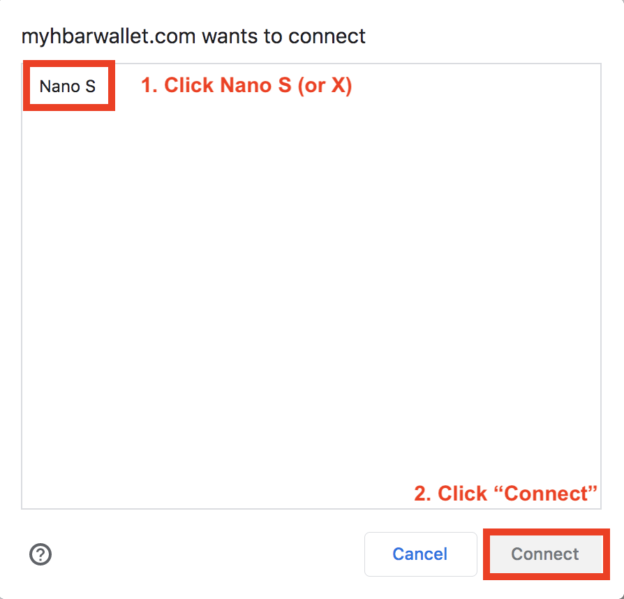 - You may see a box pop up in the left-hand corner of Chrome asking for permission to use your Ledger. If you do see this, simply click the name of the device, then click "Connect". If you do not see it, you should be fine to skip this step